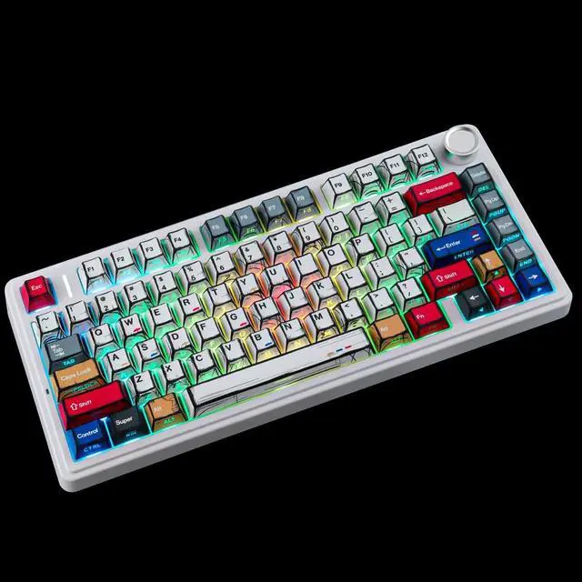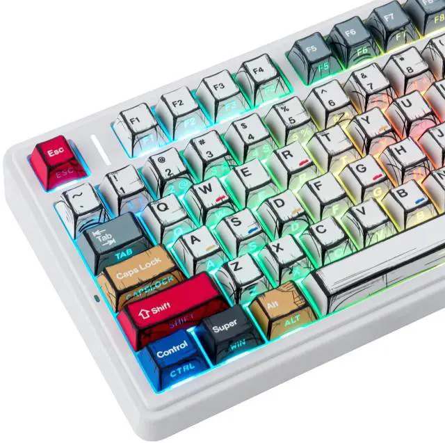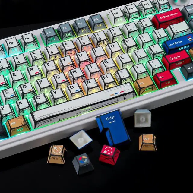 Shine Through Keycap SetThe custom keycaps use wide fonts to allow more light to shine through, improving the visibility and legibility of individual keys. ^^ Double Shot KeycapsMechanical keyboard keycaps are made of high quality PBT keycaps and oil repellent coating. Greatly improve the durability and practicality of the keycap. ^^ Cherry Profile Keycapscherry keycaps have larger surface contact and larger finger touch area for long-lasting comfortable typing. You won't get tired even if you type for a long time. ^^ Durable PBT MaterialThese PBT keycaps are made of textured, high-grade PBT and are resistant to wear, friction, and solvents.