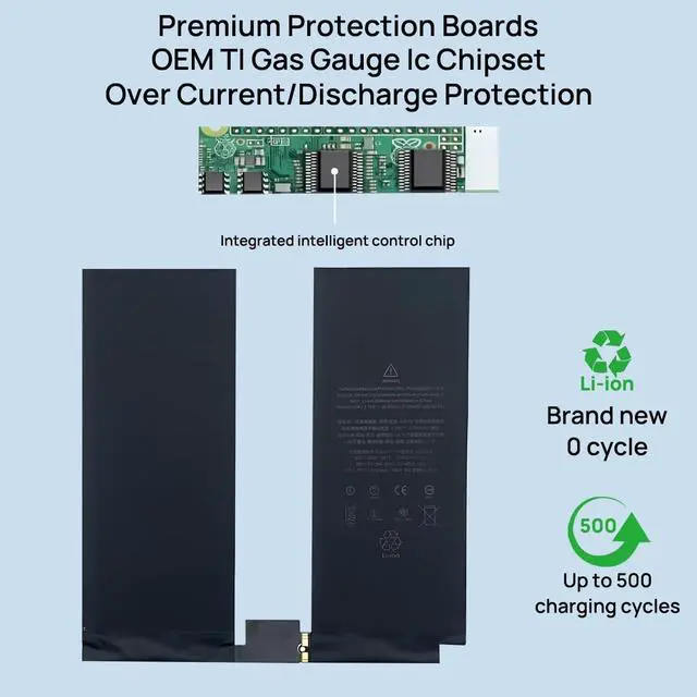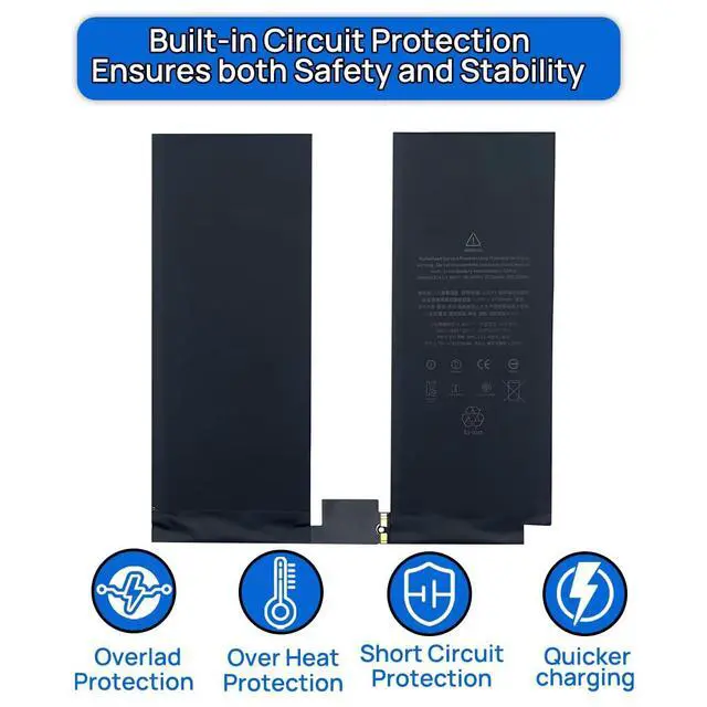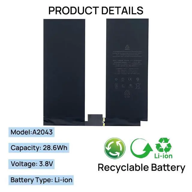 Battery life: Up to 500 recharge cycles. ^^ Compatible Part NumberCompatible with A2043. ^^ Compatible Laptop ModelsCompatible with iPad Pro 12.9" 3rd Gen 2018 4th Gen 2020 A1895 A1983 A1876 A2069 A2232 A2233 A2229 A2014 Series Tablet. ^^ Security and ProtectionOur battery is equipped with an integrated intelligent control chip, offers multi-faceted safety features, including safeguards against overcharging, over-discharging, over-voltage, over-current situations, and overheating. It provides comprehensive protection, safeguarding both you and your device from potential risks, ensuring worry-free usage at all times. ^^ Confidence Warranty and Customer ServiceWe hold unwavering faith in the quality and performance of our batteries. That's precisely why we offer a 12-month warranty and all day email support. If you have any issue, simply click on "Contact Seller" within your order details at any time.
