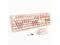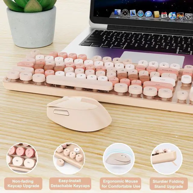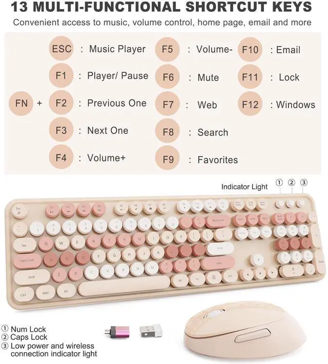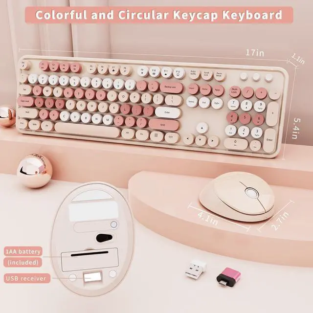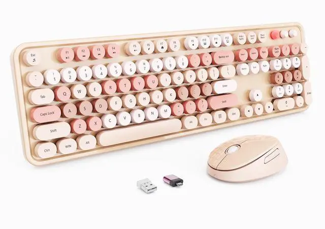 FADE-RESISTANT KEYS & RELIABLE CONNECTION This milk tea-colored wireless keyboard and mouse set features fade-resistant keycaps and a stable 2.4GH z wireless connection up to 33 feet. The plug-and-play design allows quick, driver-free setup. ^^ RETRO WIRELESS KEYBOARD AND MOUSE SET This typewriter-style keyboard boasts a vintage design with iconic round keycaps. The wireless keyboard and mouse combo is reliable and perfect for home, office, or college. Free replacement for damaged receivers. ^^ COMFORTABLE ERGONOMIC DESIGN The full-size keyboard with a numeric keypad supports multitasking, while the ergonomic mouse minimizes wrist strain and provides comfort during long hours of use.
