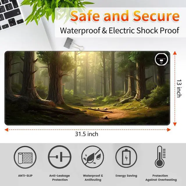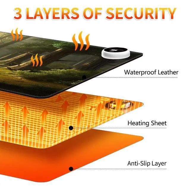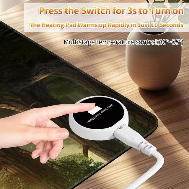 Rubber basePackage includes: 1 x Heated Desk PadWhy Choose Us? Short-circuit, self-limiting temperature protection device. Rapid heating in 10 seconds. Multistage temperature control(30~55). Automatic shutdown, safety first. Diverse in style and bright in color, it makes a great gift for yourself or others. The rubber bottom makes this large heating pad non-slip and easy to curl for storage. The size space is suitable, and the surface is delicate and easy to slide. The desk pad mat has delicate edges that prevent wear, deformation, and degumming during prolonged use. It is designed for security and durability while enhancing the aesthetic and lifespan of the mats. Keep your desk clean and uncluttered.