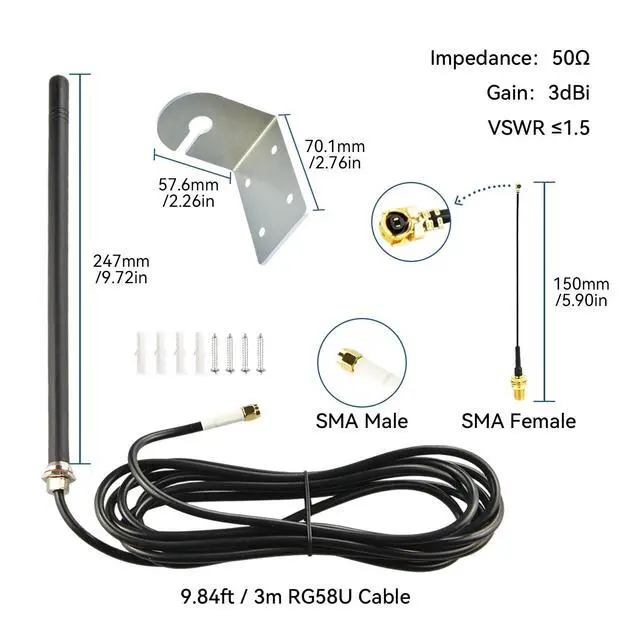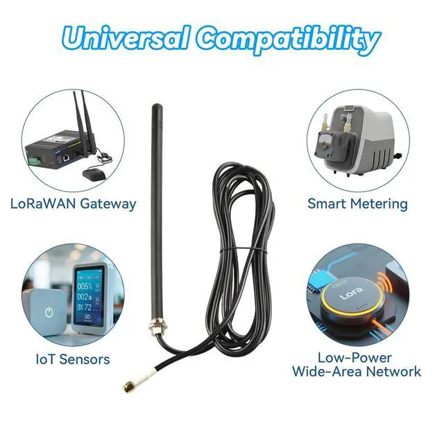 Professional 915MHz LoRa/Meshtastic OptimizationPrecisely tuned for the 915MHz ISM band with 3dBi omni-directional gain, delivering optimal performance for LoRa modules (ESP32, Heltec, LilyGo) and Meshtastic networks. Ensures reliable long-range communication in North American IoT applications. ^^ Easy to InstallThis 915MHz antenna comes with wall-mounted bracket, It can be mounted on ceilings, walls, trees, control panels or equipment cabinets. 9.84 ft RG58 coaxial cable provides flexible mounting locations. Includes an IPEX adapter. Compatible with ESP32 LoRa modules, RAK gateways, and most Meshtastic devices. ^^ 360 Omni-DirectionalProvides consistent 360 signal reception without requiring precise alignment - ideal for mobile applications and environments with multiple gateways.