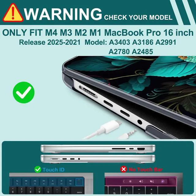 Case for MacBook Pro 16 inch M5 M4 M3 M2 M1 Pro/max 2026 2025 2024 2023 2021 model A3429 A3428 A3403 A3186 A2991 A2780 A2485. Please confirm the model on the bottom of the MacBook before ordering ^^ Durable Material - MacBook Pro 16.2 -inch case is made of hard PC material, effective anti-slip/shockproof/anti-scratch etc ^^ Case Design - The case adopts the top and bottom case separation design, easy to install and remove ^^ Case Port Design - Precise cutouts allow full access to all ports, features, buttons, and Touch ID functionality ^^ Package - Included 1 Case for MacBook Pro 16.2 inch 2025-2021, 1 Keyboard Cover, 1 Trackpad Protector, 2 OTG Adapter