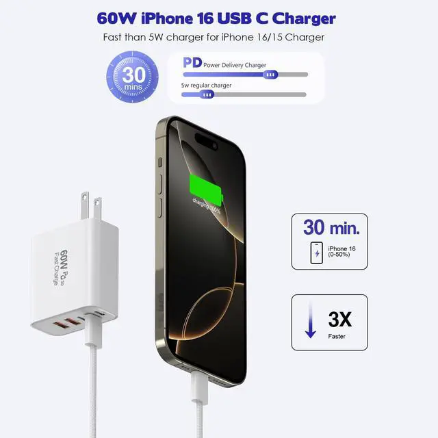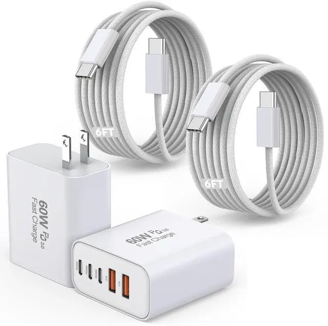 5Port 60W Multiport Charger Adapter5 in 1 design: three USB-C Port and two USB-A Port. Can charge 5 devices simultaneously. Using a single USB C charging port can achieve the highest charging power. Charge your iPhone 16 15 Pro Max up to 65% in just 30mins. Nylon braided Cable CordFor USB Type-C devices, 6Foot Charger Cable is a convenient choice. It combines practicality with efficiency, providing the extra length needed for various charging scenarios. At the same time keep in the 480 Mbps data transfer speed. USB C Fast Woven Cable