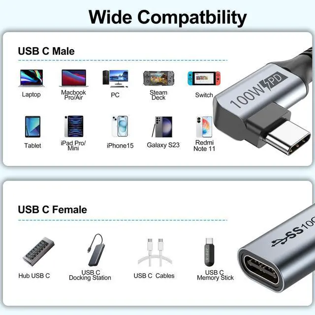 Wide CompatibilityThis Right Angle USB C Extender Cords compatibility with MacBook Pro 13/15/16 inch, MacBook Air 13/13.3 inch, MacBook 12 inch, USBC Mag-Safe Charger, Sam-sung Gaxla-y Note 20 S20, Quest Link, and other USBC Hub/Laptop/Tablet/Phone/Camera. (Note: This cable not work with any thunderbolt 3 docking/hub/cable.)