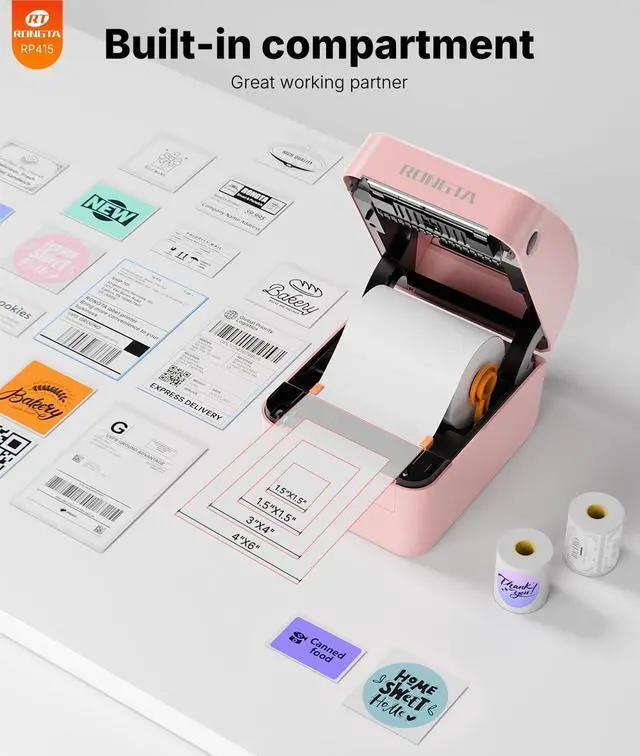 Big Built-in Label Bin: Rongta shipping label printer's revolutionary built-in label bin design supports both internal roll paper (up to 500 4x6 labels) and folded paper loading from the back, eliminating the need for extra holders. the size of this thermal label printer is 8.2 x 6.6 x 6.6 inches with built-in label bin. Undoubtedly, Our thermal printer offers you the ultimate in space-saving, making every inch of space count, helping your work easier and more efficient.