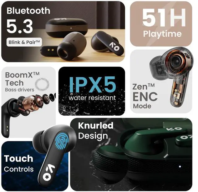 Enhance your audio experience with the Z20 earbuds. Indulge yourself in a world of pure sound with 40 hours of uninterrupted playtime. Equipped with the cutting-edge Zen Mode Tech ENC and BoomX Tech, prepare to be enthralled by a symphony of crystal-clear melodies and bass so immersive, it will transport you to an alternate dimension. Navigate effortlessly through your playlist with intuitive touch controls. Stay connected on the go with the Bluetooth 5.3 Blink & Pair technology and Pro+ calling mic, delivering quick pairing along with clear voice quality for all your important calls.