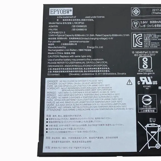 Condition: Brand New. ^^ Replace Part NumberL19C3PG0 SB10W86020 5B10W86018 L19M3PG0 SB10W86019 5B10W86021 ^^ Compatible with Laptop Models for Lenovo 10e Chromebook Tablet (Type 82AM, 82AQ) series ^^ Purchase SkillsPlease open the back cover of the laptop before ordering and make sure that the original battery model is consistent with the listing. After getting the battery, please install the battery correctly, make sure that the battery connector is firmly connected to the laptop motherboard, and use the original charger to charge the laptop. Discharge the new battery to 5% (not 0%), then charge and cycle 3-61 times to wake up the new battery. ^^ EPYOBW PromiseAll EPYOBW's batteries are certificated by UL/CE/FCC/RoHS. Our batteries are tested by strict quality control standards to ensure that the capacity is true, stable current, low self-discharge. And we also have short circuit, overheat, and overload protections. We are confident in the performance of replacement batteries and professional service.