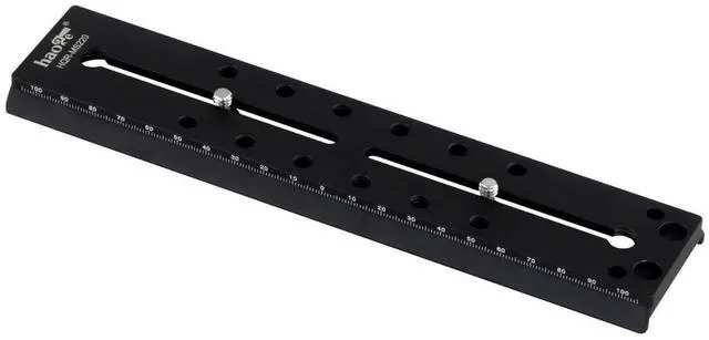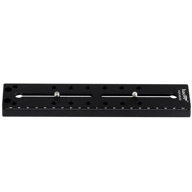 The Haoge HQR-MS220 long version quick release sliding plate is a Manfrotto-type compatible multi-purpose rail with a laser-engraved reference scale with 1mm increments on both sides. It allowing for easy nodal point adjustments. Reserved 12PCS UNC1/4 screw threads for function extensions.