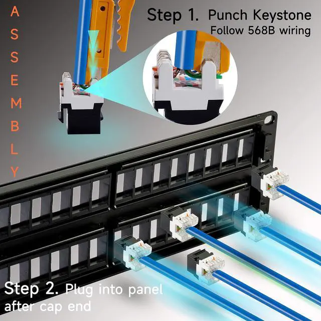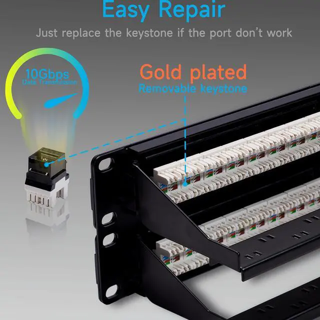 : Wall mount patch panel with punch-down keystones come with a small punch tool in the package. Transparent keystone end caps secure cables in place and cable zip ties fasten ethernet cable onto back bar to less stress relief and avoid termination issues. Rj45 patch panel is equipped with gold plated keystone jacks which provide 10 Gigabit speed transmission performance. This modular patch panel meets or exceeds Cat6 specifications and can be instead of cat 5 panel.