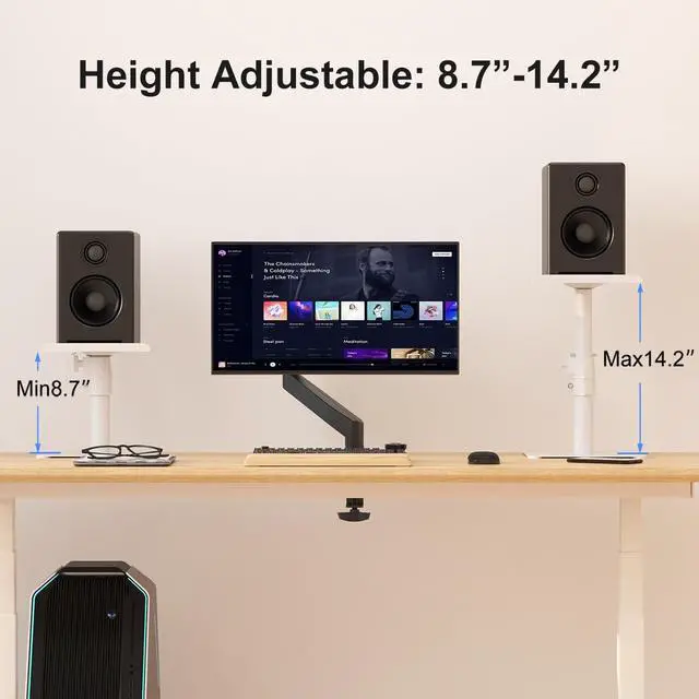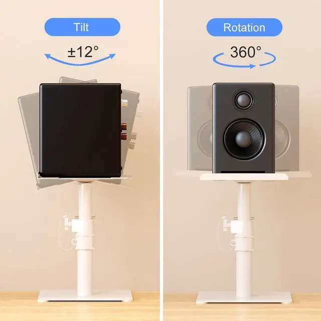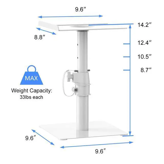 Universal - 9.6 x 8.8 platform with height-adjustable stand. Load up to 33lbs each stand. ^^ Adjustable - raise your speaker to eye level with 4-level locking pole ( 8.7 / 10.5 / 12.4 / 14.2 to the desk). Then adjust the tray to the ideal projection angle with +12 to -12 tilting capability. ^^ Stable - high-grade steel construction securely holds studio monitor speakers. Stable free standing base can move anywhere. ^^ Space-saving - raise your speaker to get the best sound from your monitor spears and you can also elevate laptop, projector, CD player and other devices to save more desk space.
