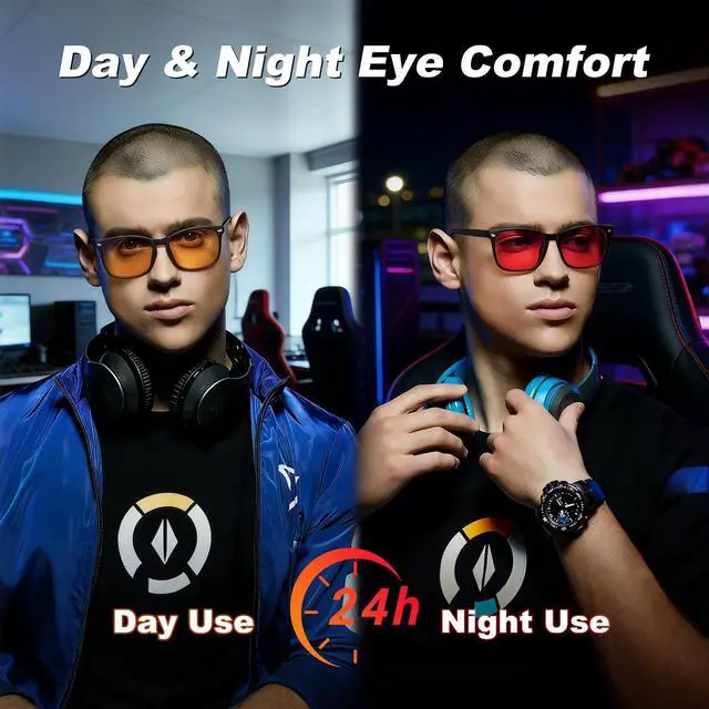 All-Day Dual-Lens Protection Engineered with German HD lenses, this dual-lens system adapts to all lighting. Amber lenses filter high-energy blue light while keeping colors trueideal for work, study, or gaming. Red lenses reduce blue/green light in the evening, helping eyes relax naturally. Lab-tested to block up to 99% of harmful screen light, keeping eyes clear, comfortable, and energized all day ^^ Amber Lenses Gaming & Daytime Focus Extended screen use can strain your eyes and slow reactions. Amber lenses filter blue light while enhancing visual contrast, making every on-screen detail easier to spot.