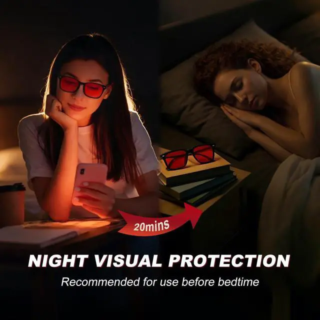 Feel your focus sharpen and your reactions become faster as your gaming performance reaches a new level. Clutch victories bring admiring looks from teammates and excited cheers from friendswhile your eyes stay comfortable through every intense match ^^ Red Lenses Evening Relaxation & Better Sleep Red lenses block 380-500 nm blue light, helping reduce eye strain in low-light environments. Whether you're reading, browsing, or unwinding after a long day, they create a calm, gentle visual atmosphere that helps your mind slow down. Wear them 2-3 hours before bed to support your natural sleep rhythmletting you fall asleep with ease and wake up refreshed, clear-headed, and full of energy ^^ Lightweight & Comfortable Design Crafted with advanced German polymer frames, ergonomic temples, and an integrated nose pad for stable, pressure-free wear.