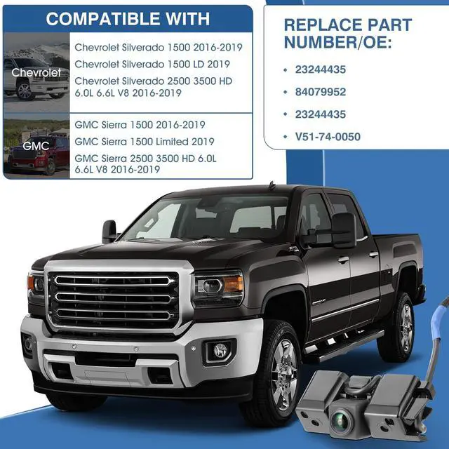 Compatible Model And YearThis Rear View Backup Camera is fit for Chevy Silverado 2500 HD 3500 HD 2016-2019, Fit for GMC Sierra 2500 HD 3500 HD 2016-2019. ^^ Replace OE NumberThe backup Camera Supports the following