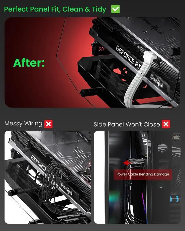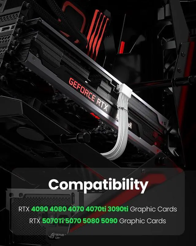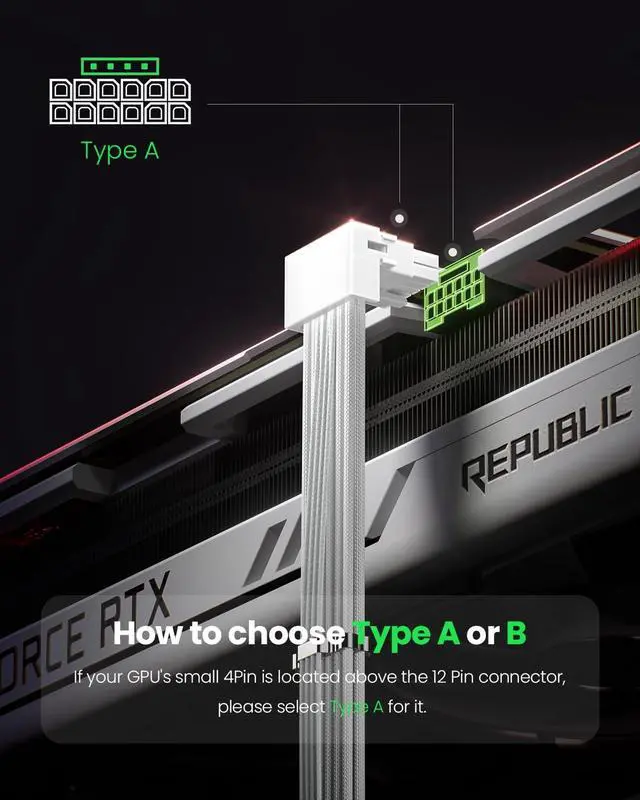 CompatibilityThis 12VHPWR (12V-2x6) extension cable is designed for GeForce RTX 3090 Ti, 4070 Ti, 4070, 4080, 4090, 5070Ti, 5070, 5080, 5090. It is also compatible with any other GPU featuring a 12V-2x6 or 12VHPWR interface. NoteThe 90-degree 16pin (12+4) converter is available in two directions. Type A is for GPUs with the small 4pin above the 12pin connector. Type B is for GPUs with the small 4pin below the 12pin connector ^^ 90 Degree Right Angled DesignThe 90 degree gpu connector prevents the graphics card's standard cables from contacting the panel.