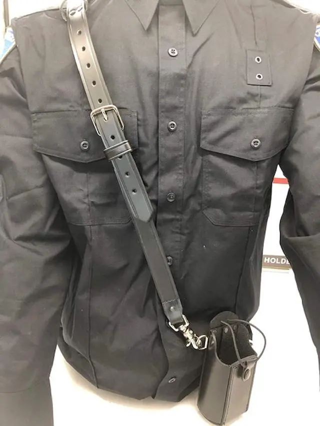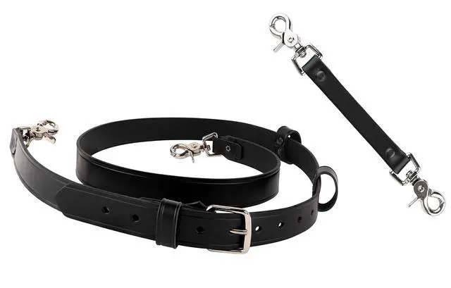 Radio Strap Features: 1.25" wide heavy duty leather. Adjustable Length From 55" - 64"Leather mic loop. Drum Dyed LeatherMates to a radio holder with scissor snaps.