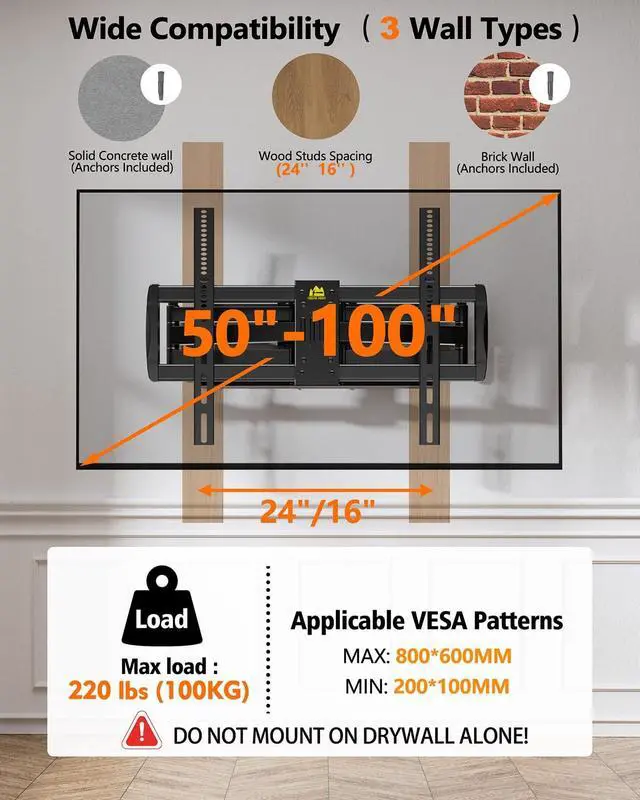 Wide Compatibility Universal TV Mount: This wall mount TV bracket is designed to fit most 42-110 flat or curved TVs with VESA patterns 200x100 to 800x600mm. The 86 inch TV wall mount can be installed on 24/16/18 wood studs or solid concrete walls, and brick walls. Please do not mount on drywall alone. ^^ Excellent viewing experience
