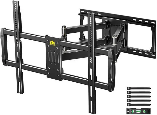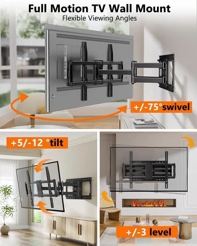 Full Motion TV Mount: The 86 inch TV wall mount can be tilted +12/-5and swivesled +/-75for comfortable viewing angle. Designed with Dual articulation arms, your TV can be extended up 26" and retracted back to 3.2", which save some valuable space for you.