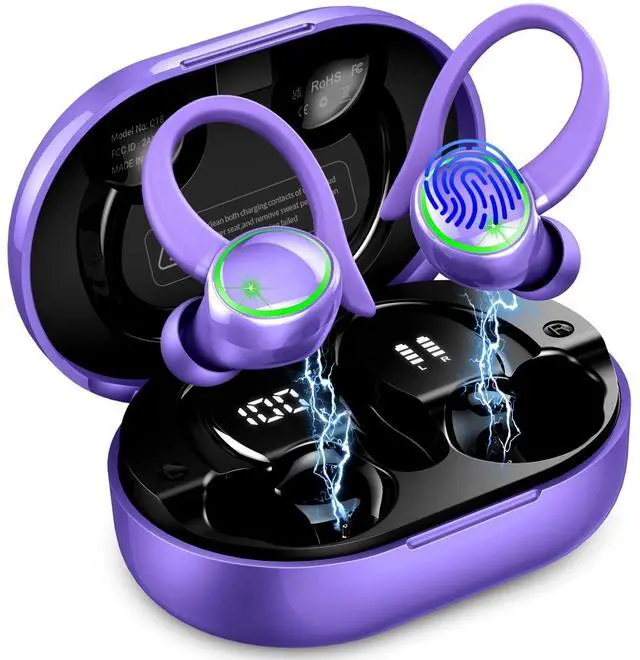 Charging Case: Bluetooth earbuds deliver up to 60 hours of total playtime with the charging case. Each earbud provides 8 hours of playback per charge, and the case can recharge the earbuds six times. A 10-minute fast charge via USB-C supplies an additional 2 hours of playtime. The earbuds are equipped with a dual LED digital display. During charging, the LED lights flash to indicate the charging progress, displaying the battery percentage from 1% to 100%. ^^ Ergonomic Sports Design and