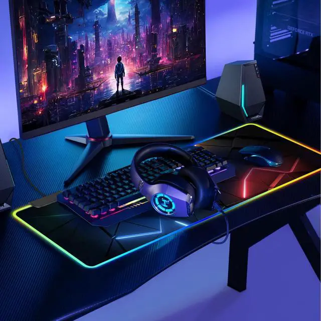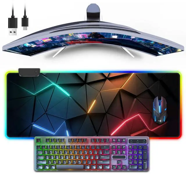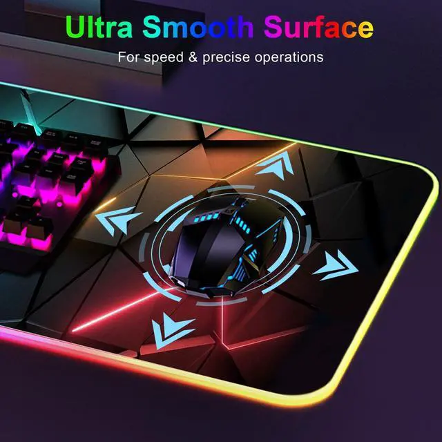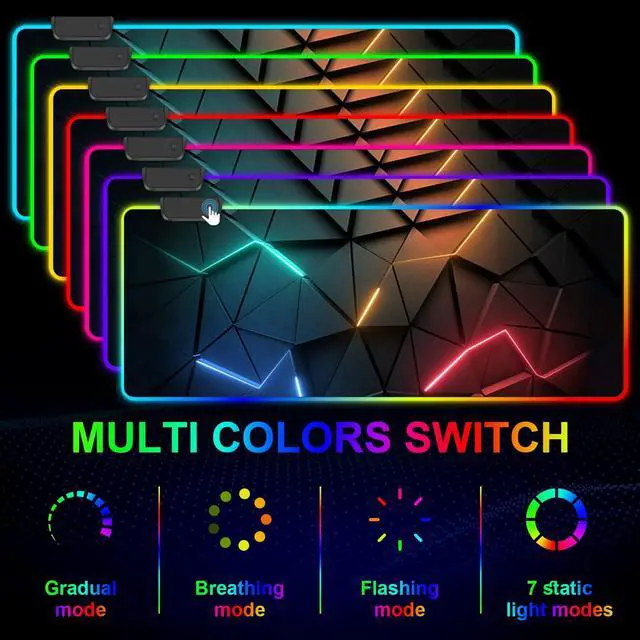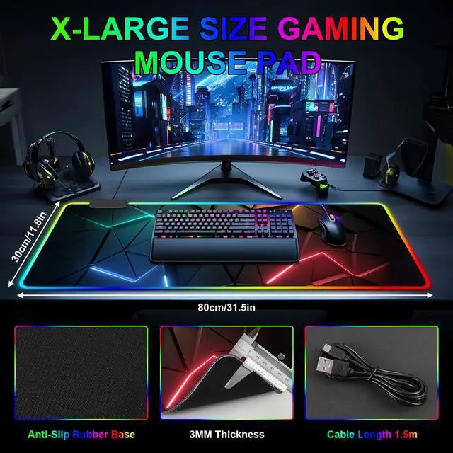 Perfect SizeThe size of the oversized mouse pad is 31.5 x 11.8 inches (80X 30CM), with a thickness of 3mm/ 0.12IN. This gaming series RGB illuminated mouse pad is perfect for gaming enthusiasts or mechanical keyboards and mice or other gaming keyboards! ^^ 3D Cool Pattern DesignOur mouse pad features a special line design, realistic 3D effect patterns and colors, simple, stylish, and durable. Cool mouse pads can showcase your personality and unique charm in work, gaming, and entertainment! ^^ RGB 13 LED Lighting ModesWe have expanded the large keyboard and mouse pad with 13 lighting modes, including 7 static lighting modes and 6 color flashing modes.