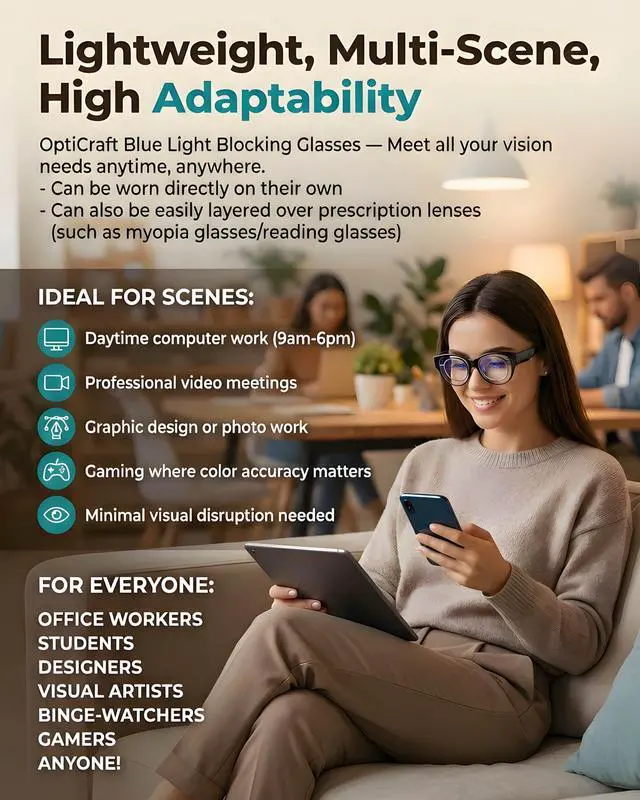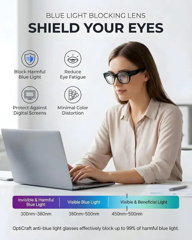 EFFECTIVE BLUE LIGHT BLOCKING: Equipped with advanced blue light filtering technology, OptiCraft anti-blue light lenses are specially engineered to block harmful blue ray from digital screenssuch as computers, smartphones, and tabletsmore effectively than standard lenses, helping reduce digital eye strain. ^^