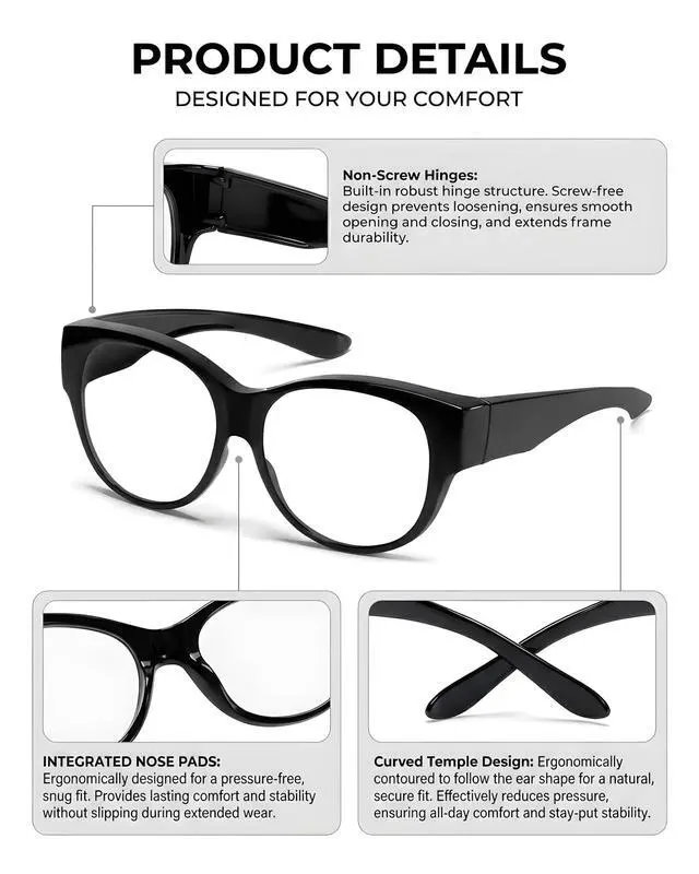 COMFORTABLE ERGONOMIC WEAR EXPERIENCE: The lightweight plastic frame is adorned with a refined glossy coating. The one-piece nose pad employs ergonomic design for zero pressure during wear. The curved, wide temples not only contour to the shape of your ears, but also effectively conceal the temples of your prescription glasses, adding a touch of effortless elegance to your look.