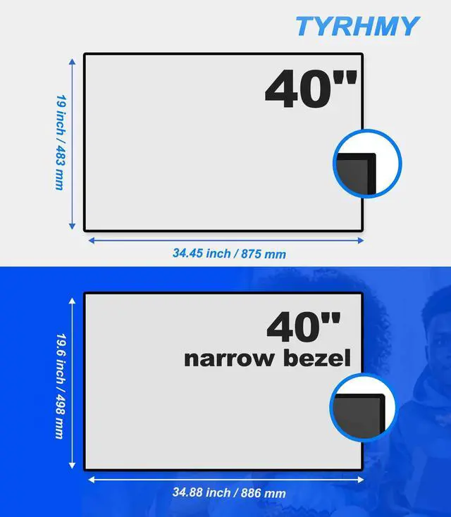 This screen protector is compatible with two 40 inch TV screen sizes. Please compare your TV's inner screen dimensions with our specification chart. The screen protector must match the screen size or be slightly smaller than the screen. ^^ Anti Glare for TVThe premium matte coating effectively reduces reflections and glare, providing a comfortable viewing experience even in bright indoor or outdoor settings. Enjoy your favorite shows without light interference. ^^ Outdoor Usage GuidelinesWhen used outdoors, place your TV under a roof or in a shaded area. Direct sunlight on the screen will affect the anti-glare function, and the protector cannot prevent issues caused by prolonged sunlight exposure.