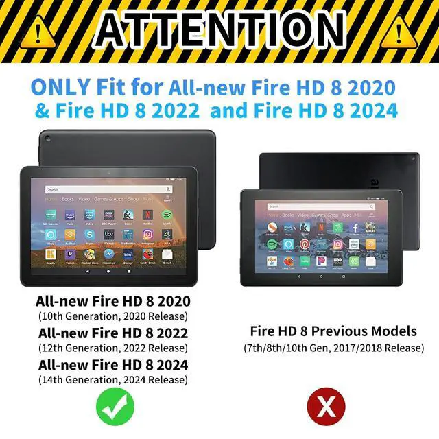 Only CompatibilitySpecifically designed for Fire HD 8 Tablet Case (12th/10th Generation, 2024/2022/2020 Release) ONLY. Will NOT fit any other Kindle or Fire devices, please double check your tablet model. ^^ Auto Wake/SleepAutomatically wakes or puts tablet to sleep when the lid is opened and closed, wakes the tablet case up, saving power for longer reading time. ^^ Stable Stand DesignAdjustable stand offers a 60vedios viewing position and a 30typing position, satisfying your needs on your Kindle HD 8 tablet. Free your hands for other entertainments. ^^ Premium Material It was made of premium PU leather exterior with soft TPU back and soft microfiber interior - Snug fit, lightweight and protective.