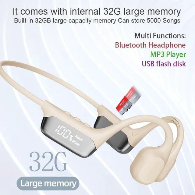 ^^ Bluetooth Mode and MP3 Mode ChangeableThis headphone has two Modes, you are able to connect it to your cell phone and you can also save your favorite songs in the headphone and play them directly without connect to other device (MP3 function). Built-in 16GB large-capacity memory inside allows you to save more than 1500 songs inside. You can also use it as a USB flash disk if you like. Provides in-call stereo premium sound. ^^ Lightweight and Painless WearErgonomic Open ear design,. only 0.07 pounds weight makes your ears unburdened. The high-strength memory titanium alloy frame is flexible and durable, it can be bent and stretched without deformation.
