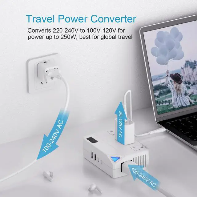 Universal Compatible: Supply max up 250 watts power converter for international travel. 3 AC Outlets and 4 USB Charging Ports support simultaneous charging of multiple devices. Includes your hair straightener, curling iron, electrical shaver/hair cutter, CPAP/Respiratory machine, toothbrush, fan, nebulizer, game console, laptop, camera, watch, and other electronic devices.