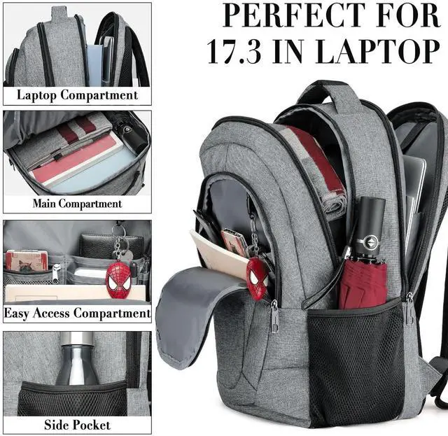 STORAGE SPACE&POCKETS: The main pocket of school backpack is equipped with a separate laptop soft compartment hold 17-inch laptops and 16-inch, 15-inch, 14-inch and 13-inch Macbooks/notebooks. The soft sponge design will protect your laptop. Outside the compartment, a more spacious packing compartment roomy hold an iPad, mouse, charger, binder, books, clothes, etc. Mesh pockets are located on the sides of water bottles and compact umbrellas to keep your belongings organized and easier to find ^^