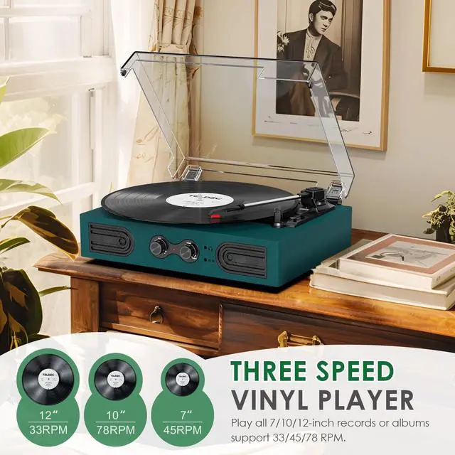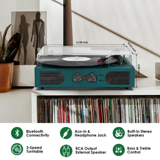 PERFECT FOR DORM/BEDROOM/OFFICE-This green record player's vintage wood design with black hardware is aesthetically pleasing, and it plays your 7" 10" 12" records with built-in dual speakers, bass and treble control, and is effortlessly portable, making it ideal for dorm rooms, bedrooms, and offices. ^^ VERSATILE CONNECTION OPTIONS -The vinyl player offers a variety of connection options to audio devices, including Bluetooth input, RCA line-out ports, AUX line-in, and 3.5 mm headphone jacks. It provides with the flexibility to play records with or without external speakers or headphones, choose the audio setup that best suits your needs.