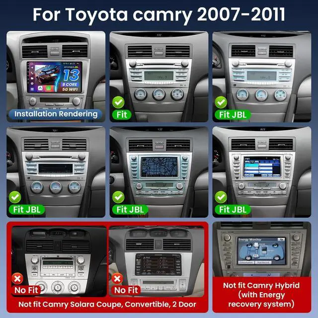 Vehicle Compatibility This radio is designed for Toyota Camry 2007 2008 2009 2010 2011(not fit 2-Door and Coupe). Included J-B-L wiring harness can be used in vehicles equipped with a factory J-B-L audio system. The stereo features a 9-inch 1280*800 HD IPS touchscreen with its stylish design and superior performance, it's the perfect addition to your vehicle. ^^ Wireless CarPlay & Android AutoWireless CarPlay and Android Auto offer a familiar and user-friendly interface, projecting your phone's content onto the head unit's large screen, allowing you to more easily use your smartphone's music, videos, map navigation, calls, notifications, and messages.