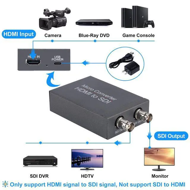 HDMI to SDI ConverterThis HDMI to SDI Converter allows HDMI signals to be shown on two SDI display while ensuring high bit rates of 3 Gbit/s to give you high resolution signal without any loss. For professionals this means that it is now easier to convert your high def HDMI signal with audio to SDI for long distance transmission and display your work on SDI display. ^^ HDMI Input Resolution480I, 480P, 576I, 576P, 720P@50/60Hz, 1080I@50/60Hz, 1080P@24/25/30/50/60Hz.