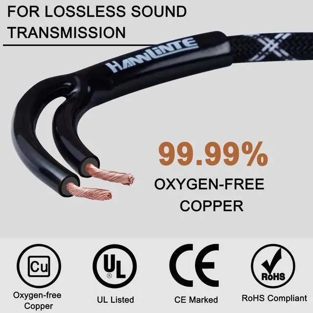 HannLinte Speaker Cable Wire- Maintain best audio and crisp clear sound with this dual conductor 12 AWG 99.99 % oxygen free copper (OFC), color coding banana plug to enable matching polarity. ^^ Gold-Plated Banana Plugs- Precision bolted interior banana plug terminations create a secure connection and a convenient alternative to cutting and terminating speaker wire with banana plugs. ^^ High-end Looking- High strand count wires in a no-slip PVC Y-Boot and a durable braided jacket, giving them extra protection to your speakers finish allowing pro-grade sound quality yet retaining the flexibility of ordinary speaker wire.