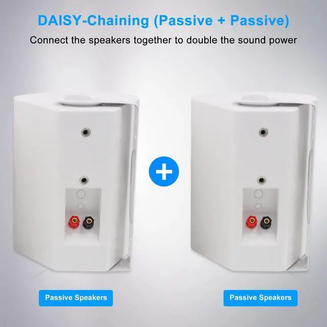 ^^ VERSATILE SWIVEL BRACKETS In order to ensure that you can place your outdoor speakers where you need them most, we have added a multi-functional wall mounted rotating bracket that is easy to install, allowing up to 120 degrees of motion, while the front face can rotate 90 degrees. Ensure easy placement and installation where you want ^^ PRODUCT DIMENSIONS (L x W x H) &WHAT YOU GET 9.57" (243mm) (L) x 7.28" (185mm) (W) x 6.57" (167mm) (H). Outdoor Speakers*4(Passive + Passive), Speakers Cables*4, Owner's Maunul*1