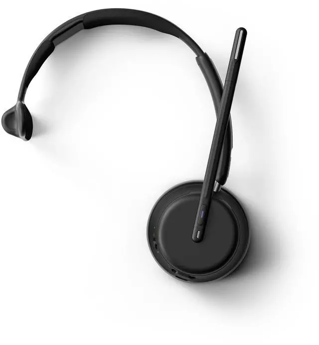 The EPOS IMPACT 1030T is a mono wireless headset with mic, designed for professionals who need clear communication while staying aware of their surroundings. Featuring EPOS AI adaptive microphones, it delivers industry-leading voice pickup, filtering out background noise for crystal-clear calls on Microsoft Teams, Zoom, and Skype. With a single-sided design, the headset keeps one ear open while providing all-day comfort with soft ear cushions and a padded headband. Its 360-degree busylight helps minimize distractions by signaling when you're on a call, ensuring a focused and professional work environment.