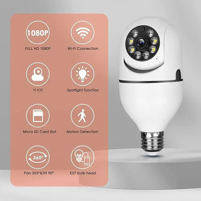 ^^ Motion Detection and Real-time AlertsThe Light Bulb Security Camera Outdoor 360 degree camera bulb security camera system adopts a highly sensitive motion sensort, Connect The camera to WIFI, When a moving object is detected, it will record the moving picture and notify you through the APP. ^^ Two-Way Audio and High Quality ServiceLight Bulb Security Camera Outdoor Wifi Built-in microphone and speaker, the bulb security camera can have a conversation between you and your visitor, If you have any question, please contact us. We provide technical support and services. ^^ Wide Monitor AreasPTZ Home Security Camera supports 355 horizontal rotation and 95 vertical rotation.