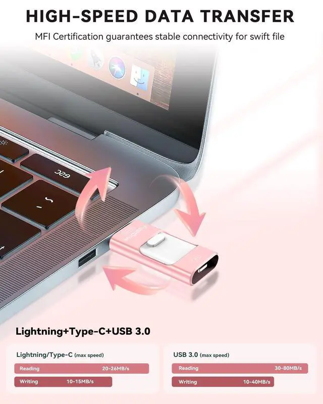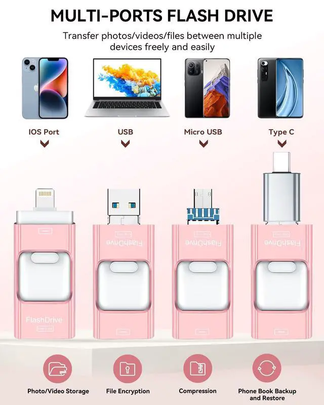 ^^ Universal 4-in-1 Compatibility: Featuring Lightning, Type-C (with separate adapters), micro USB and USB interfaces, this iphone photo storage stick connects seamlessly with iOS devices, Android OTG phones, laptops, and tablets. No iCloud fees, no internet requiredjust plug in and move files freely between your phone, computer, and other devices. ^^ Premium Build & Smart File Management: Smart flash drive made from high-quality aluminum alloy, this iPhone external storage ensures reliable performance. The dedicated app lets you view, copy, move, and delete files directly. With one-click sharing, you can easily transfer files, making it an ideal solution for freeing up iPhone storage space. ^^ Secure Your Memories with