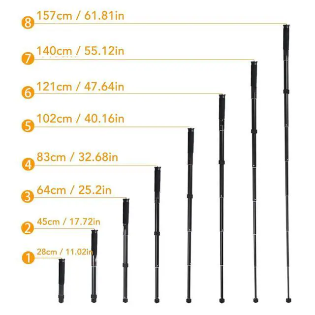 ^^ Flexible Extension: Supports knob adjustment, the camera monopod can be extended from 28cm to 157cm to be used as selfie stick, trekking pole, etc.