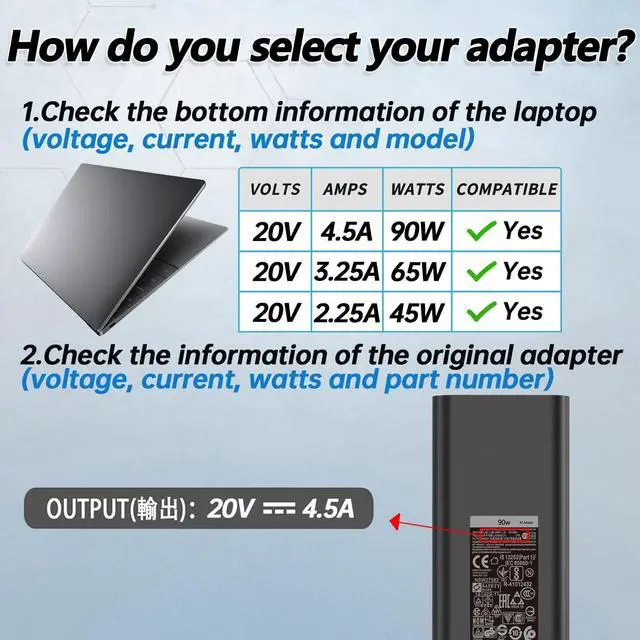 90W usb c type c ac adapter: input 100-240v 50/60hz; output 5v/3a 9v/3a 12v/3a 20v/ 4.5 a; power 90w; support 65w usb c charger; connector: usb c type c ^^