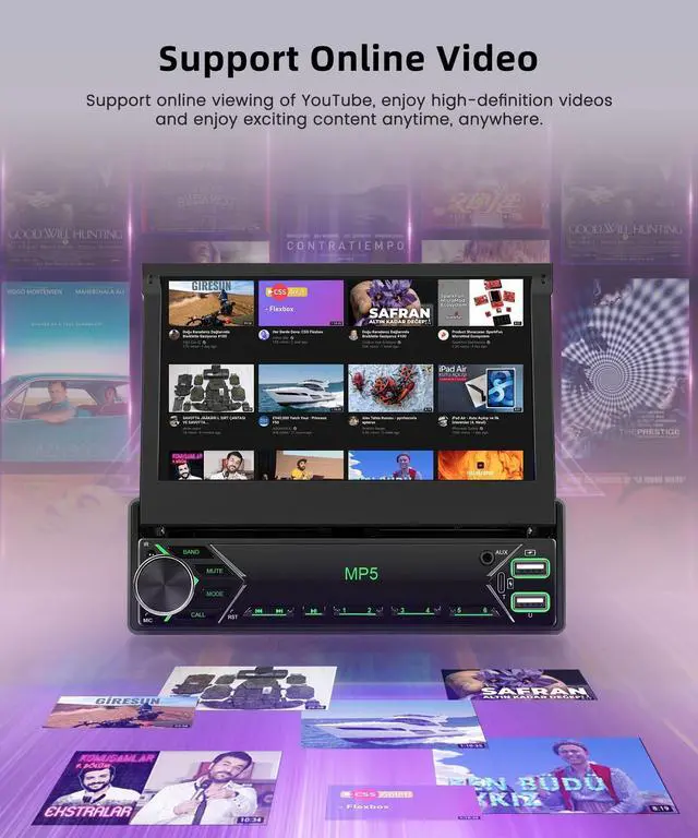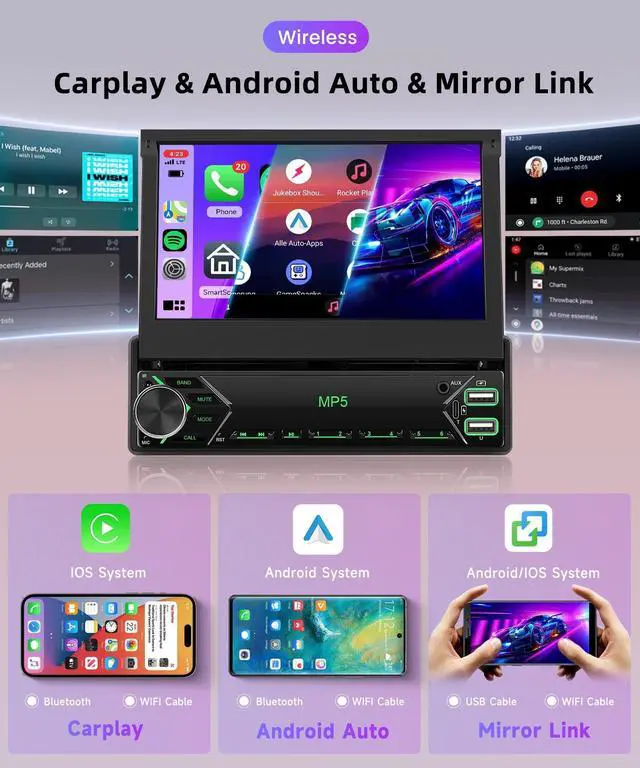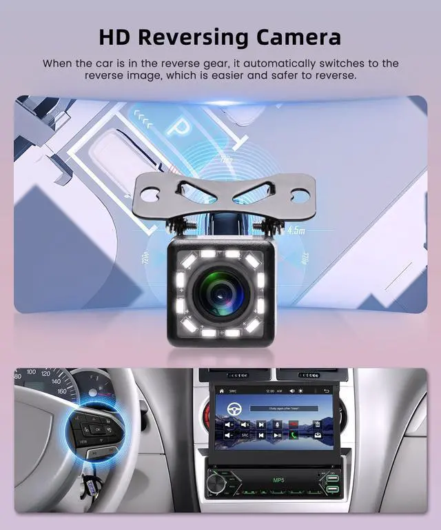 Mirror link: Single din flip out ar stereo support use iPhone or Android phone wirelessly with the device, and control your phone's apps. can make calls, send messages, play music, navigate with just your voice or touch. 1din car radio support IOS/Android mirror link, use USB cable or WIFi, mirror your phone's screen on the device's display, You can use your phone's apps, music, videos, etc on the device. ^^ Bluetooth/FM Radio/SWCSingle din carplay with bluetooth for hands-free answering and making calls, playing music intelligently. 1 din flip up screen supports FM radio, with 18 preset stations, you can listen to real-time traffic, news broadcasts, weather forecasts etc. Support original steering wheel control, conveniently switch your songs/ volumes/ calls that enhances driving safety greatly. ^^ Rear View Camera InputSingle din car stereo touchscreen with backup camera, 12 LED camera has a 170 wide-angle lens and IP68 waterproof, supports automatic display of image. when the vehicle shifts into reversethe 1 din car radio screen will automatically display the reverse image and record the traffic, make your daily reversing safer and more convenient.