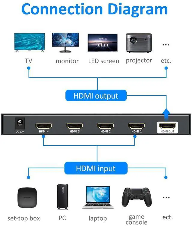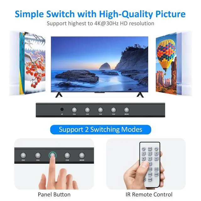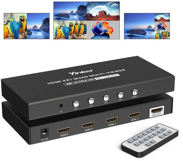 ^^ 2 Switching Methods: Easily pressing the panel button or control it through the IR remote. Supports 50ft connection distance and 15ft IR remote switching. ^^ 4 in 1 out HDMI Multiviewer Supports resolution up to 1080P@60Hz, also 720P, 1080i, 1024x768, 1360x768. Compatible HDMI 1.3 a and HDCP 1.2. ^^ Package includes 1xHDMI Multiviewer, 1xPower adapter, 1xIR remote and 1xUser Manual. Get support from YinkerStore.