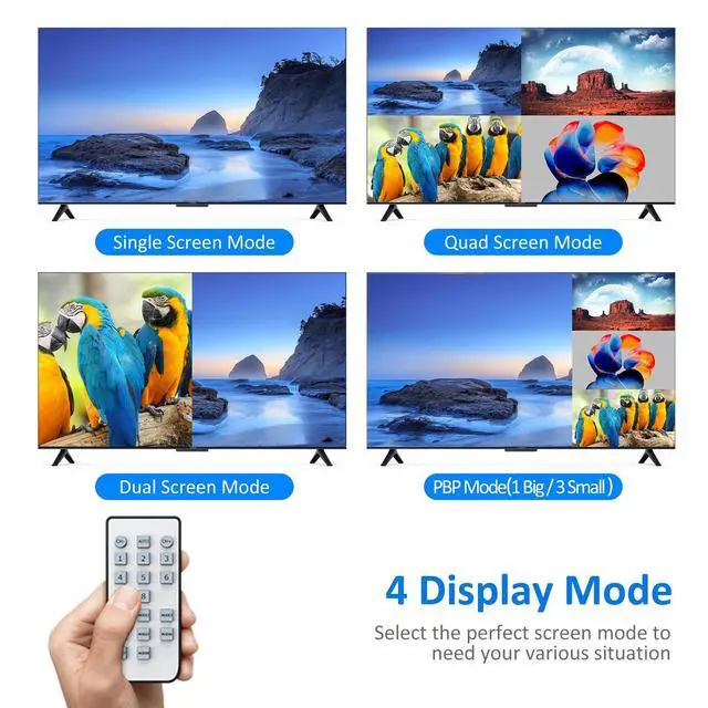 Yinker 4K HDMI Multi-viewer 4x1 allows connecting 4 input sources and display to 1 HD HDMI output screen(monitor, projector, TV, etc. ) ^^ Quad HDMI Multiviewer supports 4 display modes: 1 HDMI Output/ 4 HDMI Output/ Dual Output/ 1 Big&3 Small Output. Audio output changed in different display modes, please read the below detail information.