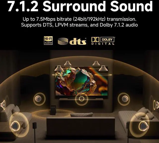 Crafted from POF optical fiber, this spdif optic audio cable transmits light signals via the principle of total internal reflection. It delivers fully immune to EMI and ground loop noise, ensuring superior signal integrity with exceptional multi-channel scalability and support for 24-bit/192kHz formats ^^ Delivering pristine, lossless signal transmission up to 1000 metersfor clearer sound, more lifelike images, and a wider dynamic range. This optical cable supports Dolby, DTS, and 7.1. 2 surround sound audio systems, while also delivering up to 16 channels of audio via its ADAT interface, making it the best choice for audiophiles.