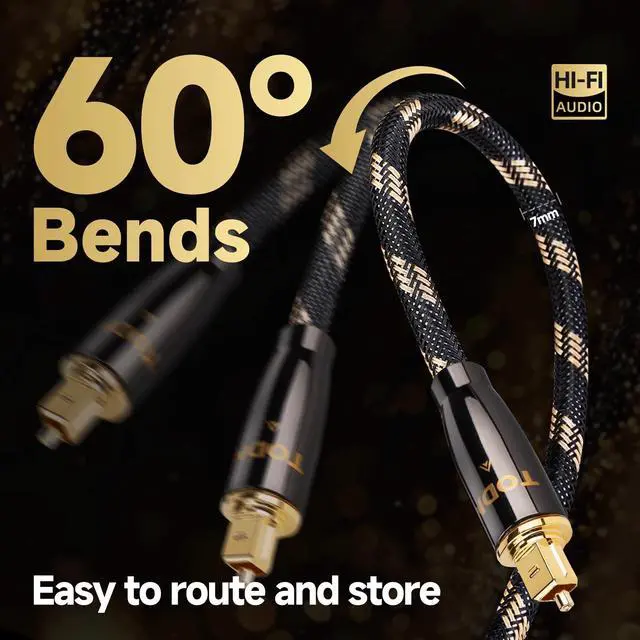 ^^ This digital optical audio cable features corrosion-resistant 5 24K gold-plated pure copper plugs for reliable connections, minimizing signal loss. And comes with a pure copper shell to enhance conductivity and effectively block external interference ^^ With 7 mm diameters, this digital audio optical cable features nylon braided jacket - an abrasion-resistant, tangle-free design. And this fiber optic cable allows for large 60 bends for easy to route and store ^^ This optical audio cable fits for TOSLINK ports (OPT In / OPT Out or S/PDIF In / S/PDIF Out). Perfect for the sound bar to receiver/preamp, audio processor, DAC, TV and PS4, Playstation, Xbox gaming systems etc.