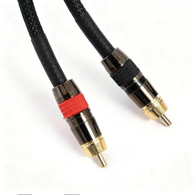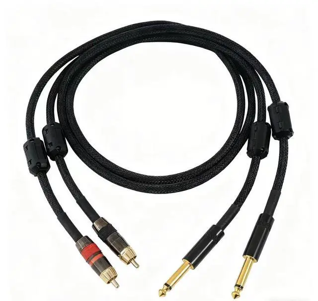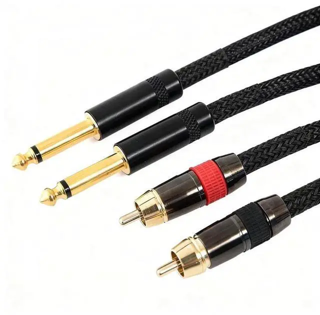 Elevate your audio setup with this professional-grade cable set featuring premium black braided RCA to 1/4-inch dual connectors. The robust braided shield provides superior noise rejection and durability, while gold-plated terminals ensure optimal signal transfer and corrosion resistance. Perfect for studio recording, live sound applications, or high-end home audio systems, these cables deliver pristine sound quality without interference. The heavy-duty construction includes strain relief at the connectors to prevent cable damage during regular use. The flexible yet sturdy design makes cable routing and installation straightforward, while maintaining professional-grade signal integrity.