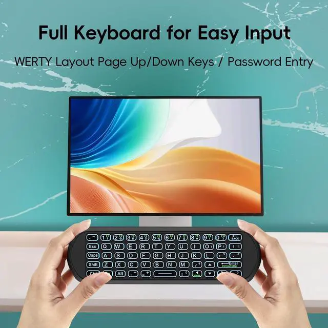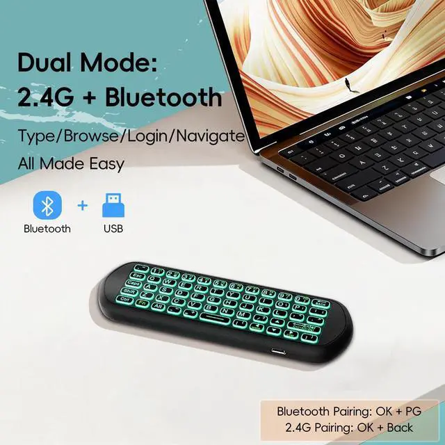 Note: System limitations prevent use with Fire TV devices, Samsug TVs, and LG webOS TVs ^^ RGB Backlit Buttons & Programmable IR LearningSeven color backlight options (red, blue, green, yellow, cyan, purple, white) make the remote visible in dark viewing environments. One-touch color switching or turn off to save power. Programmable infrared button learns one function from your existing TV remote - typically used for TV power on/off or input source switching. Reduces total remote count on your coffee table ^^ Rechargeable with Complete Accessories IncludedPackage includes the remote, USB wireless receiver, Type-C charging cable, and instruction manual - everything needed to start using immediately. No additional cable purchase required. Built-in battery recharges via Type-C port using included cable with any USB power source. Compact dimensions fit comfortably in hand during extended control sessions or tuck beside couch cushions when not in use ^^ Rechargeable with Complete Accessories IncludedPackage includes the remote, USB wireless receiver, Type-C charging cable, and instruction manual - everything needed to start using immediately. No additional cable purchase required. Built-in battery recharges via Type-C port using included cable with any USB power source.