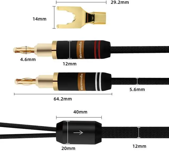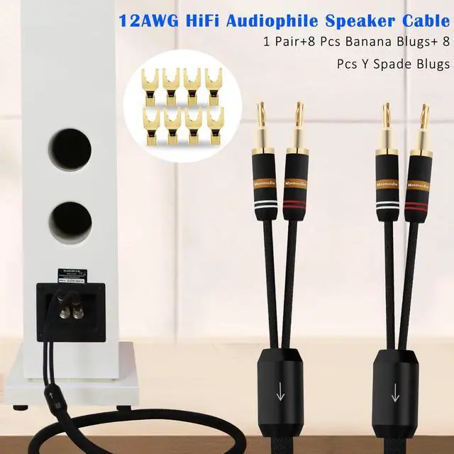 Audiophile Speaker CableMonosaudio Speaker cable with banana plugs and Y spade Connection is fine copper connector with 24K Gold-plated and solid copper housing ensures anti-oxidation, reliability and eliminates noise.