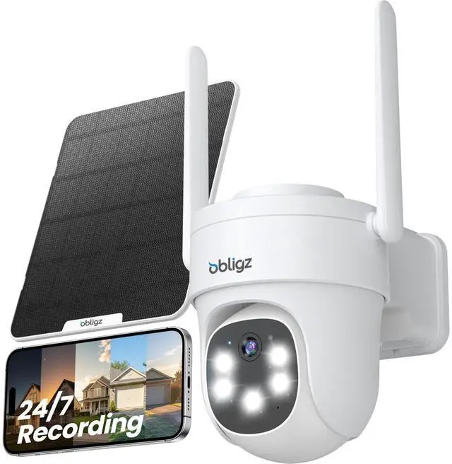 Note: supports 2.4GH z Wi-Fi only (5GHz not compatible) ^^ [2K High-Definition & Color Night Vision] The 3MP wireless outdoor camera captures every detail, delivering a superior visual experience in 2K video quality compared to standard 1080P wireless cameras. Obligz home camera comes with 4pcs infrared light and 4pcs spotlightoffer both crystal infrade night vision and real colorful night vision even in the dark. Besides, 2 way audio allow you to communicate instantly with others. ^^ [6W Upgrade Forever Solar Power] Daily direct sunlight is enough to power the Obligz solar security cameras wireless outdoor, so you never have to change the battery regularly. Solar powered security camera outdoor utilizes sunlight to recharge their batteries, focusing on an environmentally friendly and energy-saving concept. Put it on the wall, then you could start 365 days surveillance. ^^ [Flexible Storage & IP67 Weatherproof] Choose your storage solution between local video storage (up to 512GB, not included), and 6-second free cloud storage for 7 days. With advanced H. 265 compression, Obligz security camera outdoor doubles recording time compared to older formats. Built for extreme conditions, it operates from -4F to 122F (-20C to 50C) and stands up to heavy rain, heat, and freezing weather.