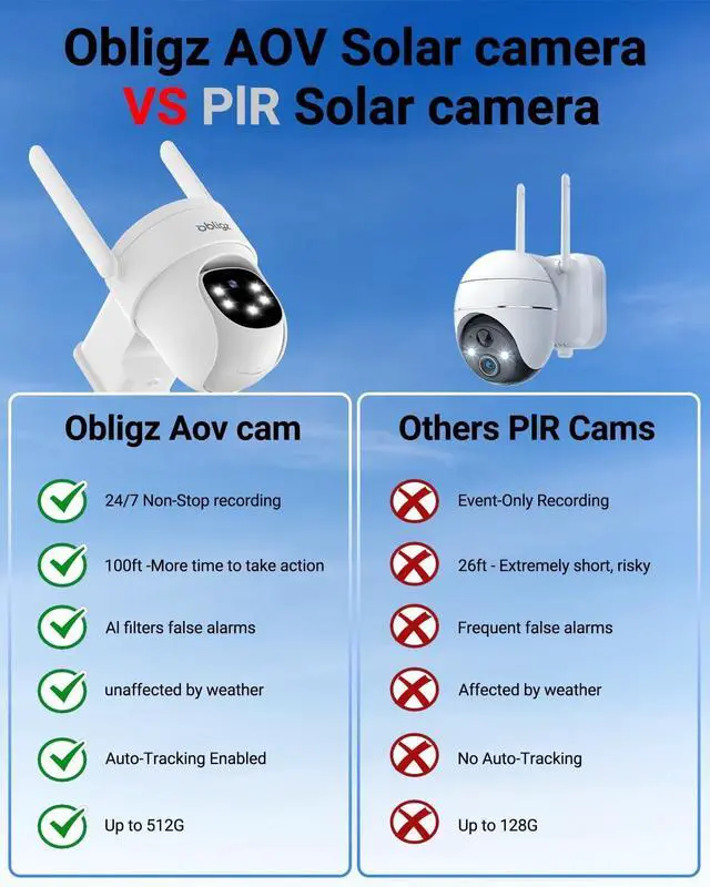 The 360 camera outdoor effortlessly monitors your porch, backyard, and driveway, delivering a panoramic view around your house. ^^ [90FT Ultra-Long Detect Distance] 90-foot detection range provides much wider coverage area, experience 3X longer than standard solar cameras. Obligz AOV security cameras wireless outdoor detects farther, respond faster, ensuring critical extra seconds to activate recording as evidence and alarm you before intruders invade your private space. Giving you peace of mind whether you're home or away. ^^ [AI Detection & Smart Security Alerts] Powered by fully AI-driven technology, the outdoor cameras for home security accurately identify people and vehicles with no monthly fees.